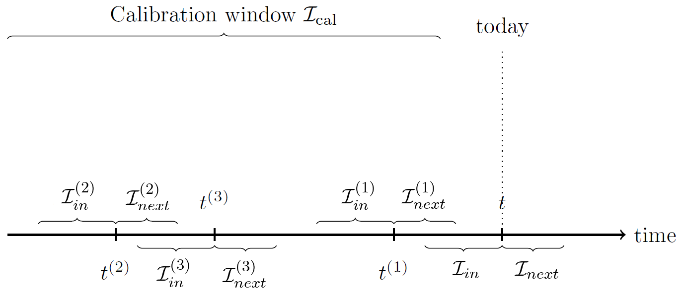 - $\mathcal{I}_{cal} = [t_{cal}, T - h_{next}]$ a long calibration window, with $t_{cal}$ chosen so that $t_{cal} \geq h_{in} - 1$ and $| \mathcal{I}_{cal} | \gg h_{in}$