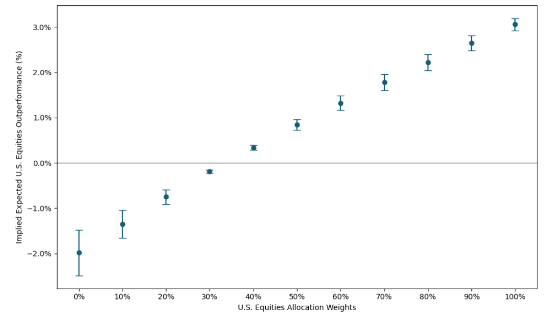 In the later case, he can use Figure 4 as a decision support, for it depicts different possible ranges45 of expected annualized outperformance of U.S. equities over ex-U.S. equities as implied by U.S. equities allocation weights.