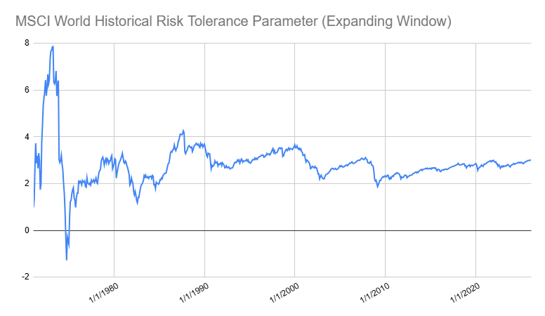 Figure 3. Historical risk tolerance parameter, MSCI World index, expanding window over the period January 1979 - March 2026.