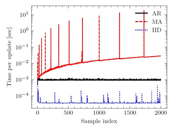 Figure 1. Computation time per online update of 200 bootstrap samples as the bootstrap techniques progress through a stream of 2000 samples. Source: Palm and Nagler. - The autoregressive online bootstrap has a slightly higher variance compared to the moving average block bootstrap, which is the cost [to] pay for its computational advantage2.