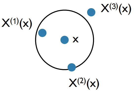 For illustration purposes, the process of selecting the 2 nearest neighbors $X_{(1)}(x)$ and $X_{(2)}(x)$ of a data point $x$ in $\mathbb{R}^2$ is outlined in Figure 2.