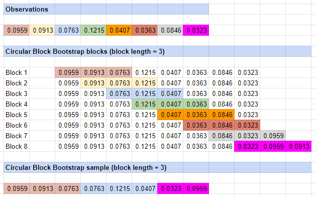The circular block bootstrap method is an extension of the moving block bootstrap method of Künsch11 and Liu and Singh12 designed to fix the main shortcoming of the latter, which is that the observations at the beginning and at the end of the observed sample of data are undersampled in the bootstrap samples14.