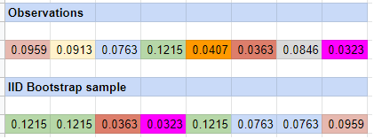 As a consequence, the i.i.d. bootstrap method is not appropriate in case of dependent data8, because resampling the individual observations $X_i, i=1..n$ independently of each other ignores any dependence structure (e.g. serial correlation) present in the observed sample of data.