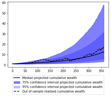 The results of the step 3, that is, 360 medians and 360 2.5-th/12.5-th/87.5-th/97.5-th percentiles, are illustrated in Figure 7, together with the realized cumulative wealth over the period January 1990 - December 2019 which corresponds to the U.S. stock returns that I held out on purpose.