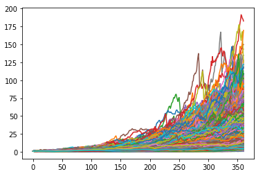 - For each bootstrap sample $i=1..10,000$ and for each $h$-month horizon $h=1..360$, compute the projected cumulative wealth29 at the $h$-month horizon $W_{h,i}$ associated to a fully invested buy and hold portfolio of U.S. stocks, with $W_{h,i}$ defined by $W_{h,i} = \prod_{t=1}^{h} \left( 1 + \hat{R}_{t,i} \right)$