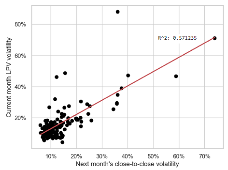 - Forecasts produced by all the volatility estimators explain on average only ~45% of the variability of the ETFs monthly volatility