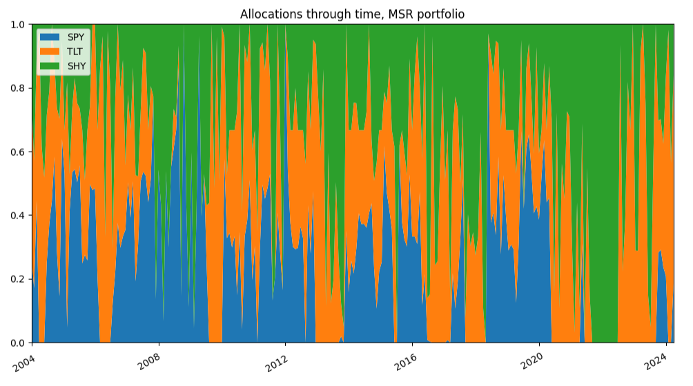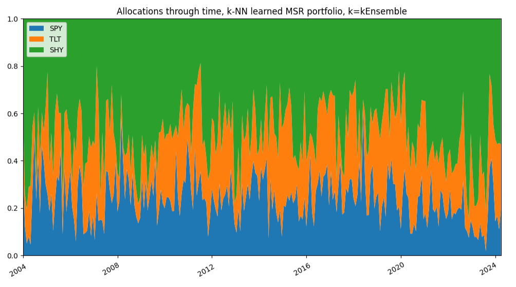Figure 8. $k$-NN-based learned MSR portfolio, $k=kEnsemble$, SPY/TLT/SHY ETFs allocations through time, 1st January 2004 - 31th March 2025. Figure 9. MSR portfolio, SPY/TLT/SHY allocations through time, 1st January 2004 - 31th March 2025. For Varadi and Teed2, this demonstrates the general uncertainty of the portfolio indicator inputs in aggregate2 and that $k$-NN learned MSR portfolio with $k=kEnsemble$ manages to dynamically balance this uncertainty over time and shift more towards a probabilistic allocation that did not overweight or over-react to poor information2.