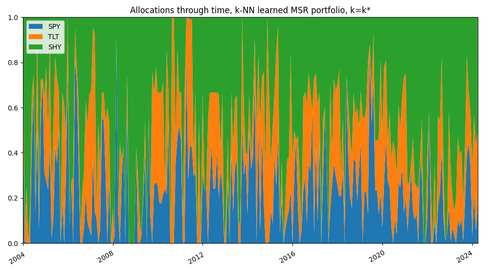 Figure 10. $k$-NN-based learned MSR portfolio, $k=k^*$, SPY/TLT/SHY ETFs allocations through time, 1st January 2004 - 31th March 2025.