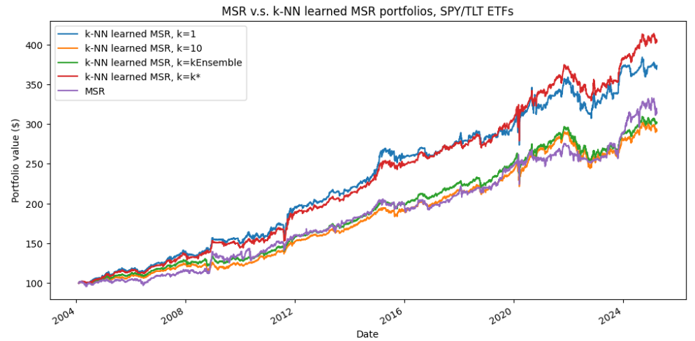 In this blog post, I empirically demonstrated that this capability allows one of their simplest embodiement - $k$-NN-based supervised portfolios - to outperform a traditional mean-variance framework that seeks to maximize the Sharpe ratio of a portfolio, which independently confirms the prior results of Varadi and Teed2.