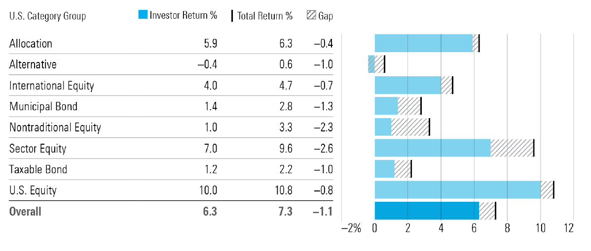 Figure 5. Investor return gaps by U.S. category group (10-year returns, 2013-2023). Source: Morningstar.