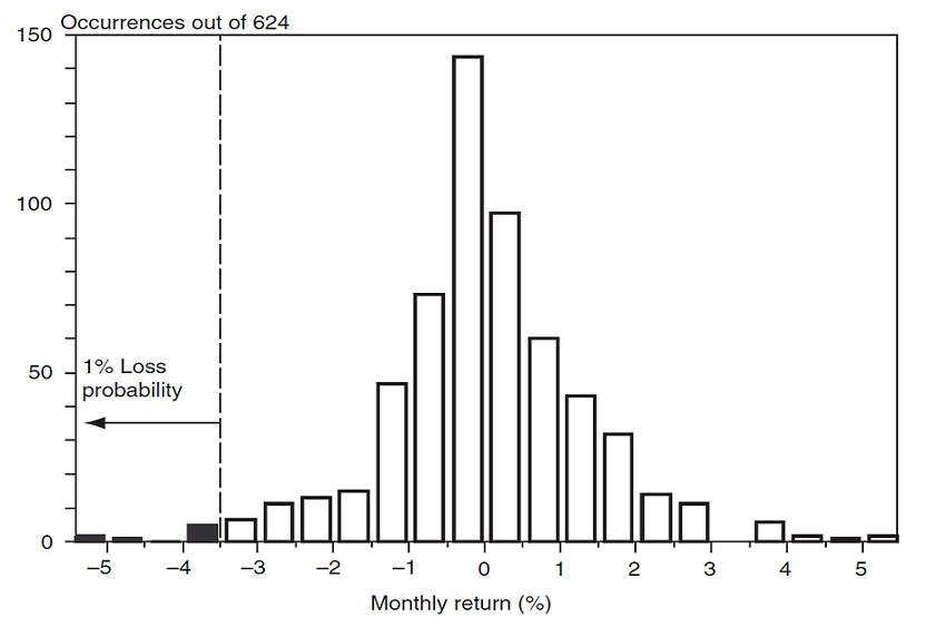 Figure 2. Graphical illustration of a portfolio VaR as a quantile of its discrete monthly return distribution, $\alpha$ = 99%. Source: Jorion.