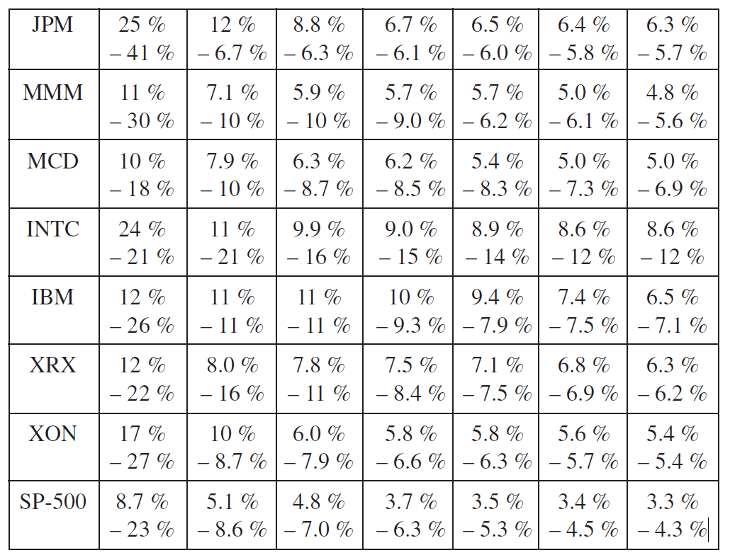 The closer one gets to the extremes, the longer the interval between adjacent returns becomes. This can be seen in [Figure 3] where the 7 largest and smallest returns on the stocks in the sample portfolio and SP-500 Index for 10 years are listed. These extreme observations are typically the most important for VaR analysis, however since these values are clearly discrete, the VaR will also be discrete, and hence be either underpredicted or overpredicted.