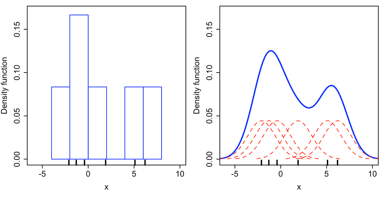 Kernel-smoothing is a methodology belonging to statistics and probability theory that can be thought of as a way of generalizing a histogram constructed with the sample data16, as illustrated in Figure 4.